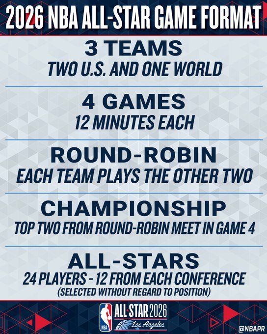 北京時間11月12日,NBA官方宣布,2026年NBA全明星賽將采用全新的“美國隊對陣世界隊”賽制。這場聯(lián)盟年度賽季中期巔峰賽事將于美國東部時間2月15日周日下午5點,在洛杉磯快船隊的主場——加利福尼亞州英格爾伍德市的英圖伊特體育館舉行。2026年NBA全明星賽中,兩支美國本土球員隊伍與一支國際球員隊伍(即世界隊)將采用循環(huán)賽制展開對決,賽事共包含4場比賽,每場比賽時長為12分鐘。三支隊伍每隊至少配備8名球員。和以往一樣,本屆全明星賽依舊選拔24名球星參賽(東西部聯(lián)盟各12人),選拔規(guī)則如下:東西部聯(lián)盟的5名首發(fā)球員,由球迷(占50%投票權(quán)重)、現(xiàn)役NBA球員(占25%投票權(quán)重)以及媒體評審團(占25%投票權(quán)重)共同投票選出;而東西部聯(lián)盟各7名替補球員,則由NBA各隊主教練共同推選產(chǎn)生。本屆全明星賽選拔球員時將不再受球員場上位置的限制。至于如何將入選球員分配至兩支美國隊,具體方案將另行公布。若全明星賽投票結(jié)果未能選出16名美國本土球員與8名國際球員(必要時可納入與其他國家有關(guān)聯(lián)的美國球員),NBA總裁蕭華將增補全明星球員至對應(yīng)隊伍,以滿足上述人數(shù)要求。若出現(xiàn)該情況,則至少有一支隊伍的球員人數(shù)會超過8人。循環(huán)賽階段的賽程安排如下:首場比賽由A隊對陣B隊;首場獲勝的隊伍將在第二場與C隊交鋒;隨后,首場失利的隊伍將在第三場迎戰(zhàn)C隊。第三場比賽結(jié)束后,戰(zhàn)績排名前兩位的隊伍將晉級總決賽(即第四場比賽)。若三場比賽戰(zhàn)罷,三支隊伍均取得1勝1負(fù)的戰(zhàn)績,則將依據(jù)各隊在循環(huán)賽兩場比賽中的凈勝分來打破平局,確定晉級名額。