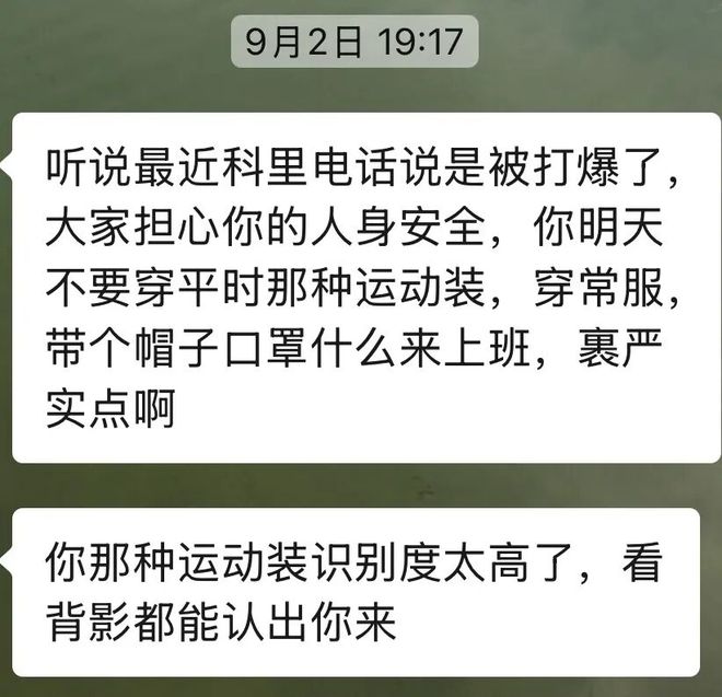 也有同事善意提醒:“聽說最近科里電話被打爆了,大家擔(dān)心你的人身安全,你不要穿那種運動服,穿常服,戴個帽子口罩來上班,裹嚴(yán)實點兒。運動裝識別度太高了,看背影都能認(rèn)出你來。”