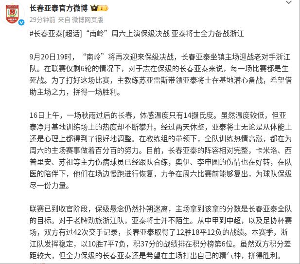 在聯(lián)賽僅剩6輪的情況下,對于志在保級的長春亞泰來說,每一場比賽都是生死戰(zhàn)。為了打好這場比賽,主教練蘇亞雷斯帶領(lǐng)亞泰將士在基地潛心備戰(zhàn),希望借助主場之力,拼得一場勝利。