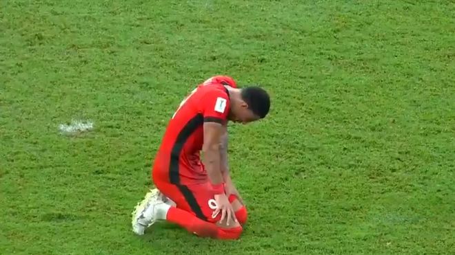 當(dāng)上港0比3落后的時(shí)候,導(dǎo)播把鏡頭對(duì)準(zhǔn)了坐在看臺(tái)上的武磊。只見這位上港前鋒在看著手機(jī)忙著聽語音,不知道聽的是不是關(guān)于球隊(duì)比賽的內(nèi)容。賽后,失望的上港外援古斯塔沃直接跪在草坪上。