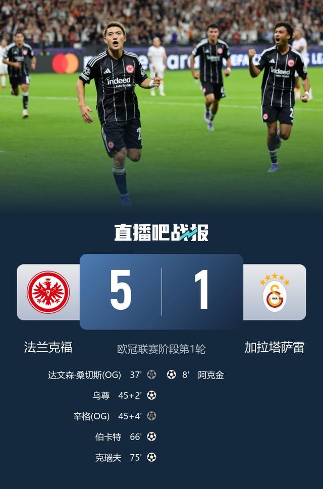 法蘭克福5-1逆轉(zhuǎn)加拉塔薩雷 伯卡特傳射烏尊破門堂安律造烏龍