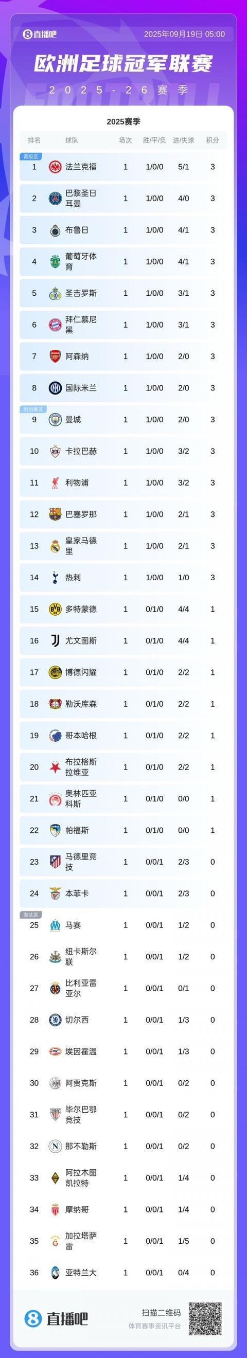 歐冠首輪積分榜:法蘭克福榜首,巴薩、曼城皆取勝,僅1場0進球