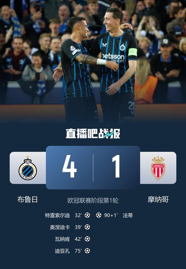布魯日4-1摩納哥,這支比利時隊伍在主場打出亮眼表現(xiàn)。客隊方面,法蒂攻入世界波不過對局面于事無補。