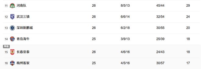 隨著深圳新鵬城1-2輸球,中超積分榜的保級(jí)形勢(shì)徹底清晰!2隊(duì)漁翁得利,分別是長春亞泰隊(duì)和青島海牛隊(duì)。本輪比賽,兩隊(duì)2-2握手言和,各拿到一分。現(xiàn)在同積18分,排名倒數(shù)第二、第三名,落后深圳新鵬城僅2分。