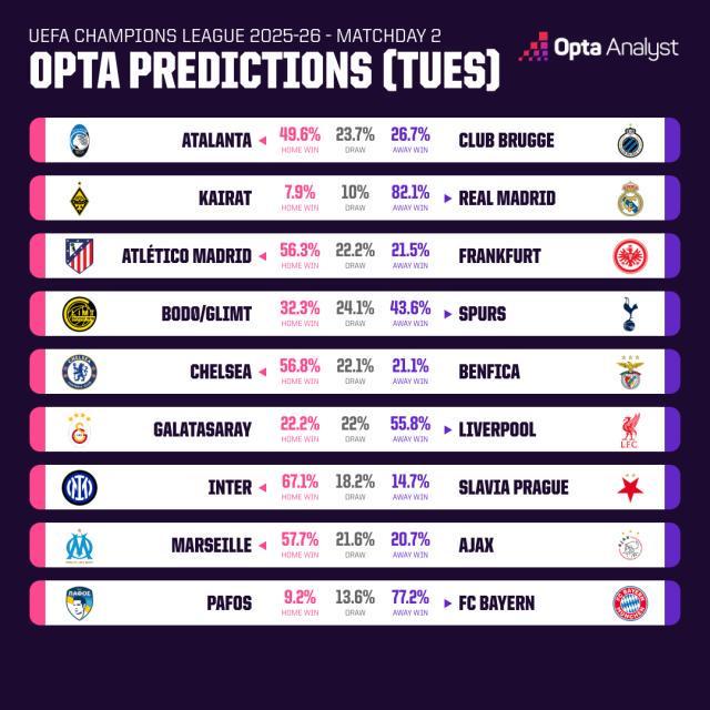 今夜歐冠聯(lián)賽第二階段開打,共有9場較量上演,包括皇馬、拜仁、馬競、國米在內(nèi)的多支傳統(tǒng)強隊均將再度登場。不過總體來看,9場之中并沒有對陣雙方量級相同的強強對話重頭戲,更多是“強弱分明”的對決。所以由Opta模擬推演出的比賽結(jié)果也大都“一邊倒”,強隊獲勝概率超過70%的比賽就有兩場,70%以下50%以上的則有5場。