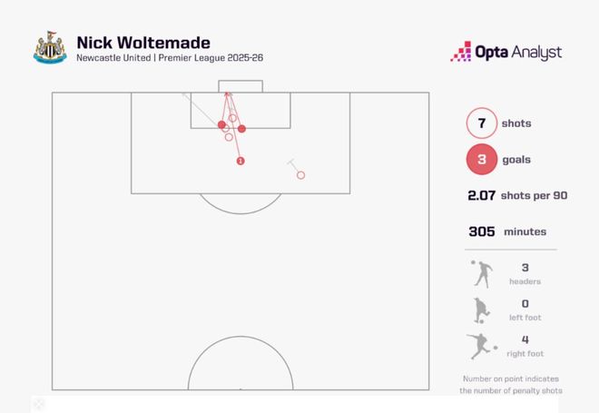 進(jìn)球方面,沃特馬德表現(xiàn)不俗,各項賽事7場打進(jìn)4球,英超4場收獲3球。盡管歐冠進(jìn)球有折射運氣成分,但他在對陣?yán)顷爼r的強(qiáng)力頭槌,以及面對阿森納時力壓加布里埃爾的破門,都展現(xiàn)出被低估的空中威脅。
