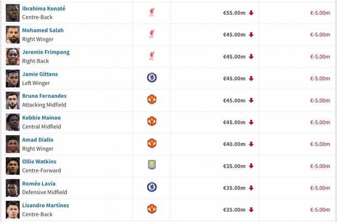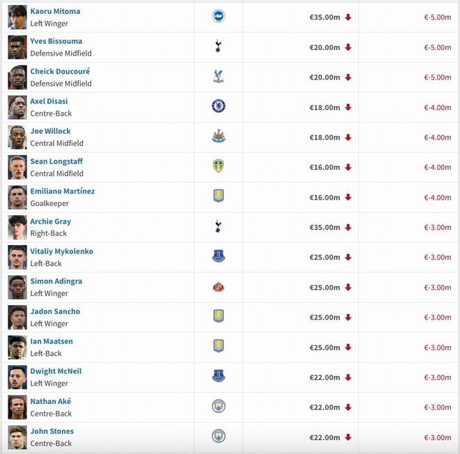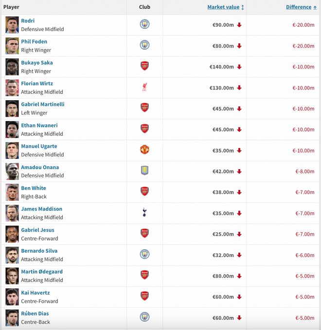 英超身價跌幅榜:羅德里、福登下跌2000萬歐,維爾茨、薩卡下降1000萬歐