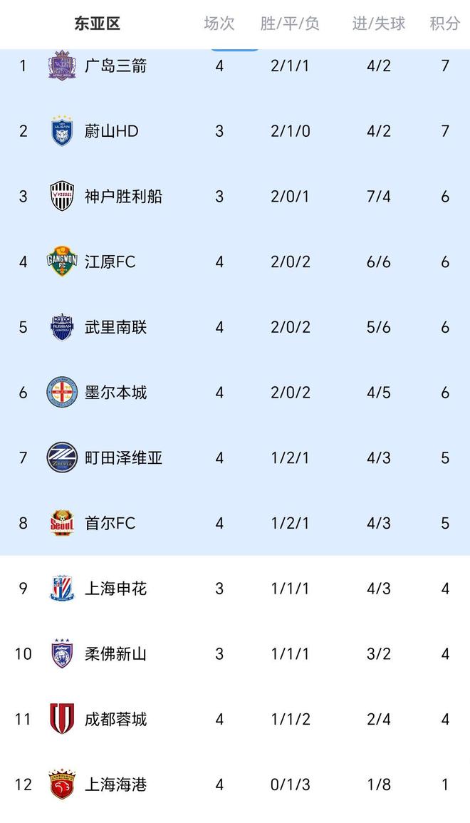 以下是亞冠東亞區(qū)的最新積分榜排名,上海海港繼續(xù)墊底,成都蓉城跌至倒數(shù)第二: